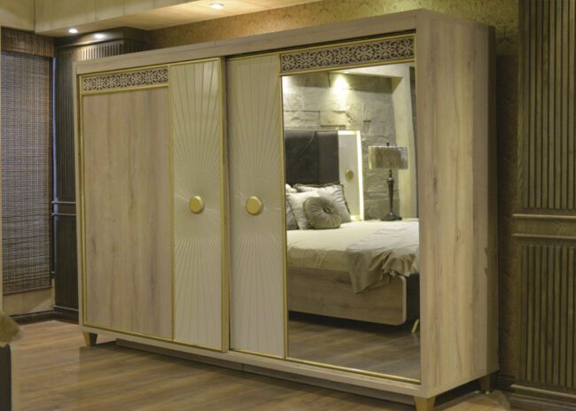 Buy the luxurious Sivas Collection Bed Set online in Pakistan at affordable prices, with free delivery available all over Pakistan. Shop now in Karachi, Lahore, Islamabad, and beyond. This upholstered bed combines high-quality MDF material with the luxurious touch of European fabric and the richness of solid walnut wood, offering a contemporary yet elegant aesthetic. The MDF frame provides a strong and stable foundation, while the solid walnut wood adds warmth, character, and a premium feel to the overall structure. The upholstered headboard is wrapped in unique European fabric such as premium linen, velvet, or jacquard, which adds a sophisticated tactile element and an inviting texture. Intricate decorative paint applied to the bed’s surface enhances its visual appeal with artistic patterns or bold colors, while the lacquered finish on the MDF ensures durability, smoothness, and a polished look. The bed’s minimalist design pairs beautifully with the solid walnut wood, making it ideal for modern interiors, offering both comfort and a luxurious, stylish presence in the bedroom.